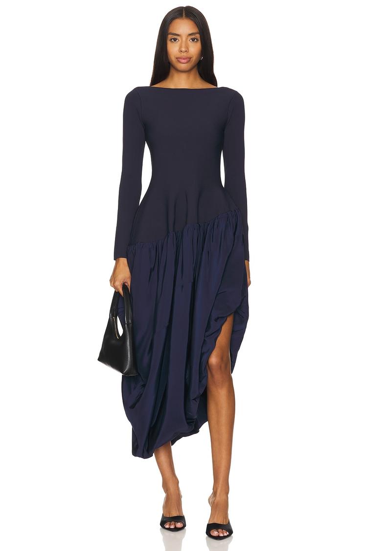 Matte navy hues blend a ponte knit top with a satin skirt to create an elegant, sophisticated midi dress perfect for brunch, date nights, or cocktail events. The straight neckline and long sleeves offer a classic silhouette, while the asymmetric bubble hem and ruffled details at the hem add a modern twist. Designed for a regular fit with pull-on styling and partial lining, this piece balances comfort and style effortlessly across seasons. Its refined construction and unique hemline make it a standout choice for versatile, polished occasions.