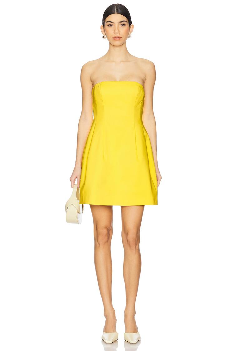 Bright yellow cotton-blend suiting fabric shapes this chic bustier mini dress with a fitted silhouette and clean hemline. The strapless straight neckline highlights the shoulders elegantly, while the concealed side zipper and hook closures ensure a sleek fit. Perfect for spring and summer evenings, this versatile dress transitions seamlessly from cocktail parties to date nights and night outs, offering an effortlessly modern and elegant look.