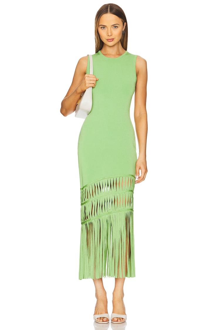 A sleek column silhouette in a matte light green hue defines this sleeveless maxi dress, crafted from a heavyweight jersey fabric blend of rayon, nylon, and spandex for a fitted yet comfortable wear. The round neckline and wide straps create a clean, modern look, while the distinctive fringed hem adds dynamic movement and subtle texture. Ideal for spring and summer occasions, this versatile piece shines at brunch, date nights, or evening outings, combining minimalist style with chic flair for effortless sophistication.