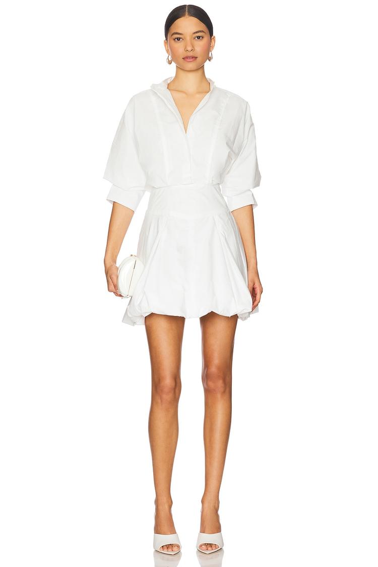 Crisp white cotton-poplin meets a playful bubble hem in this mini shirt dress, designed with three-quarter cuffed sleeves and a structured collar. Its flared fit and partial front button closure add modern minimalism to a classic silhouette, perfect for casual brunches, workwear, or relaxed date nights. The midweight fabric and full lining ensure comfort and polish through spring to autumn seasons.