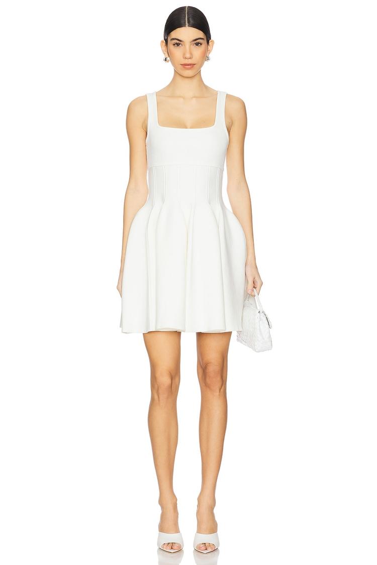 A crisp white mini dress crafted from heavyweight jacquard fabric offers a structured yet comfortable fit and flare silhouette. The square neckline and wide straps enhance its classic appeal while the sleeveless design keeps it fresh for spring and summer outings. Pull-on slip-on styling ensures easy wearability, making it an ideal choice for casual brunches, date nights, or relaxed daytime events. This fitted mini dress balances minimalist sophistication with a touch of texture, perfect for versatile styling and effortless elegance.