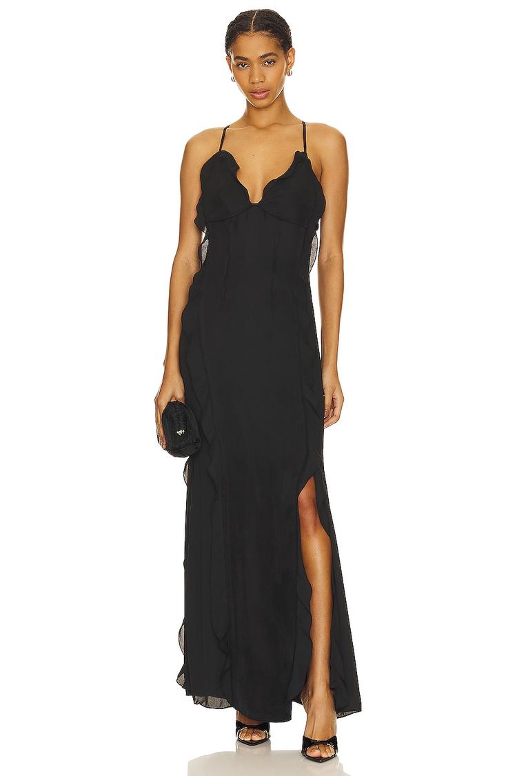 Softly flowing ruffles frame a slim column silhouette in this elegant matte black maxi dress, featuring a romantic sweetheart neckline and delicate spaghetti straps. Crafted from a blend of cupro and polyester sateen with chiffon accents, it offers both structure and graceful movement. The side slit adds a hint of allure, perfect for cocktail parties, formal events, and sophisticated night outs. Fully lined for comfort and pull-on styling for ease, this dress balances refined design with effortless wearability for a polished, sophisticated look.