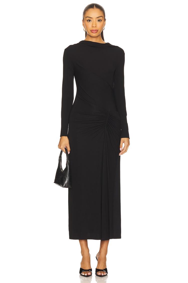 Clean lines and a sleek round neckline define this elegant black sheath dress, crafted from thick jersey fabric with a comfortable blend of rayon and elastane. The midi length and fitted silhouette highlight a sophisticated style, while the long sleeves with split cuffs add subtle drama. Front ruching enhances the figure-flattering look, making it perfect for cocktail parties, date nights, and semi-formal evenings during cooler autumn and winter months. Fully lined for comfort, this pull-on dress combines minimalist design with refined details for versatile, understated glamour.