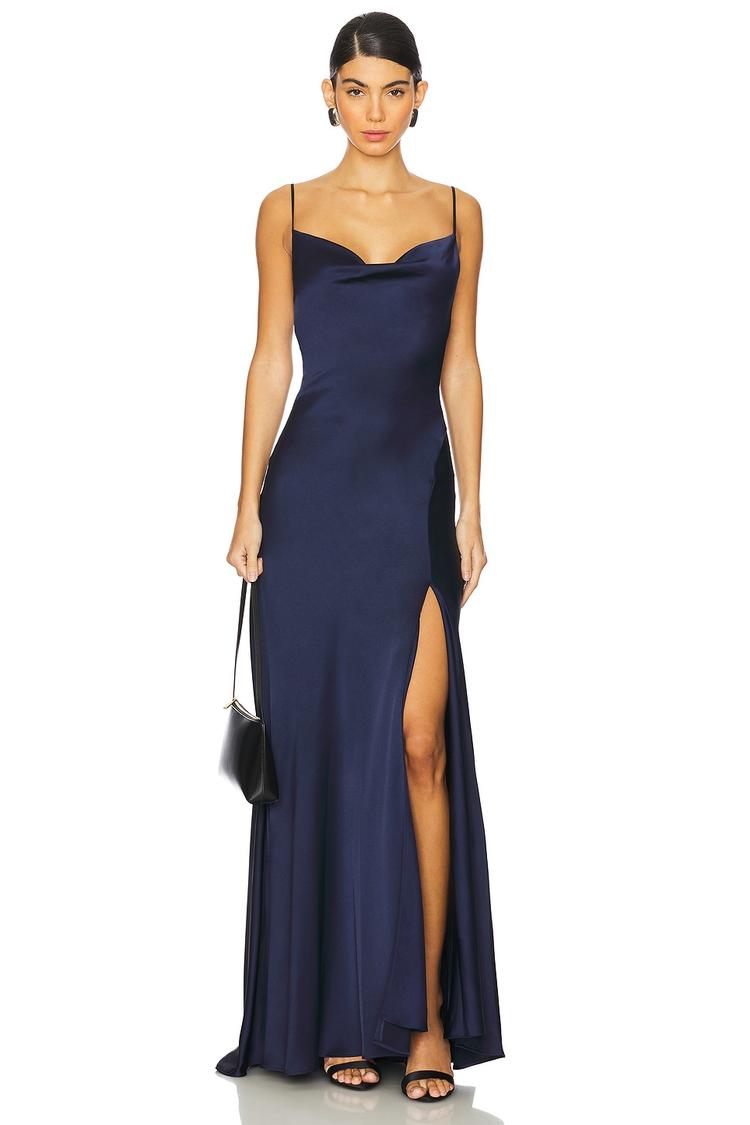 A sleek column silhouette in matte dark blue satin defines this elegant gown, featuring a flattering cowl neck and slender spaghetti straps that enhance its sophisticated appeal. The fitted cut flows gracefully into a maxi length with a clean hemline and a daring side slit for added allure. Adjustable shoulder straps ensure a perfect fit, making this gown ideal for formal occasions, cocktail parties, and black tie optional events. Crafted from lightweight satin and fully lined for comfort, it blends classic style with modern refinement effortlessly.