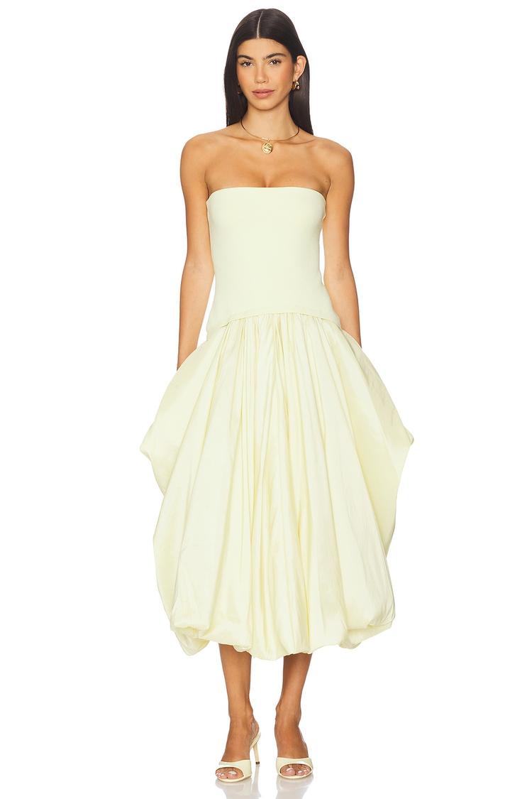 Soft cream tones and a strapless neckline define this elegant midi dress, featuring a fitted jersey bodice that contrasts beautifully with a heavyweight taffeta skirt. The A-line silhouette flows gracefully to a clean hem, hitting mid-calf for a flattering length. Functional side seam pockets add modern practicality, while the slip-on style ensures easy wear. Perfectly suited for brunch, date nights, or cocktail events, this dress blends sophistication and contemporary style with comfortable viscose, nylon, and polyester fabrics for seasonal versatility from spring through autumn.