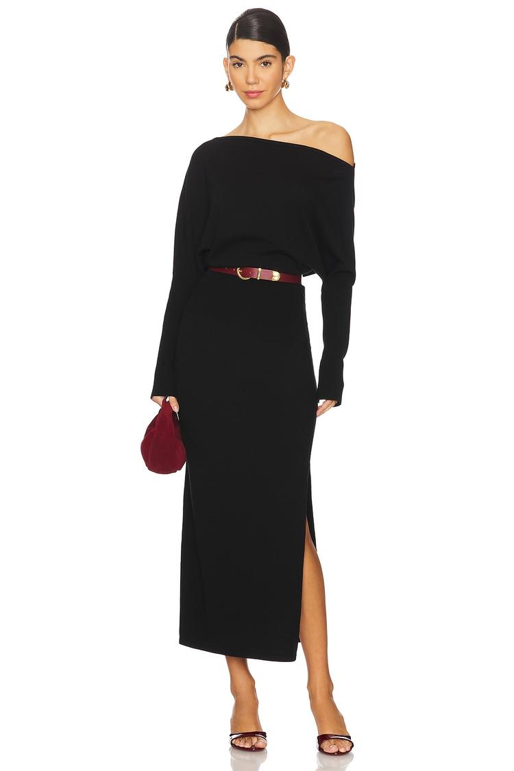 A sleek silhouette defined by an off-shoulder neckline and long fitted sleeves, this black midi dress features a subtle side slit for ease and allure. Crafted from a stretch knit blend of wool, lyocell, and polyester, it offers warmth and comfort ideal for autumn and winter evenings. The sheath fit contours the body elegantly, making it a versatile choice for cocktail parties, date nights, and night outs. Its clean hemline and minimalist design elevate understated sophistication, perfect for those seeking refined, timeless style.