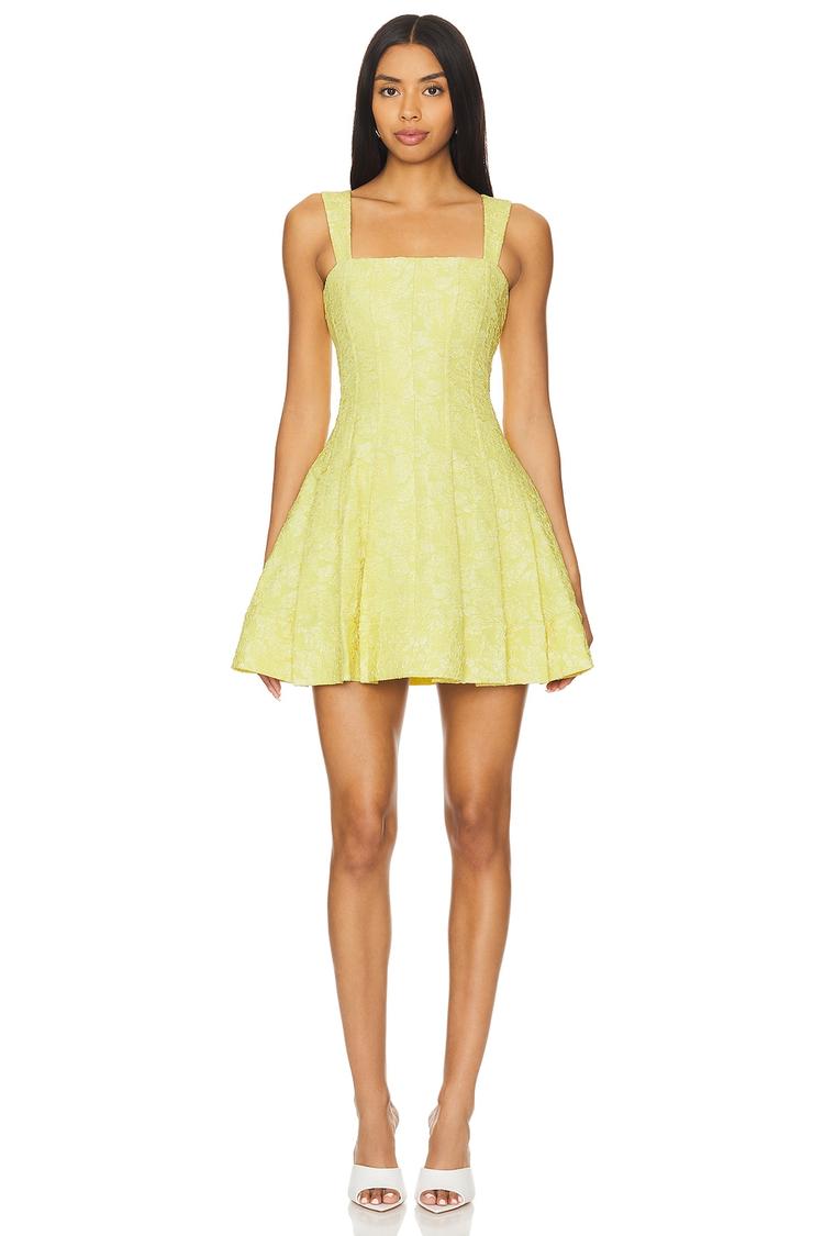 Sunlit spring and summer days call for this matte yellow fit and flare mini dress, crafted from midweight polyester jacquard fabric. Featuring a square neckline and wide straps, this sleeveless dress offers a fitted silhouette that flares beautifully with a pleated hem for dynamic movement. The hidden back zipper ensures a sleek covered back closure. Perfect for brunches, date nights, or cocktail parties, this classic and elegant design pairs versatility with modern charm, making it a standout choice for warm-weather occasions.