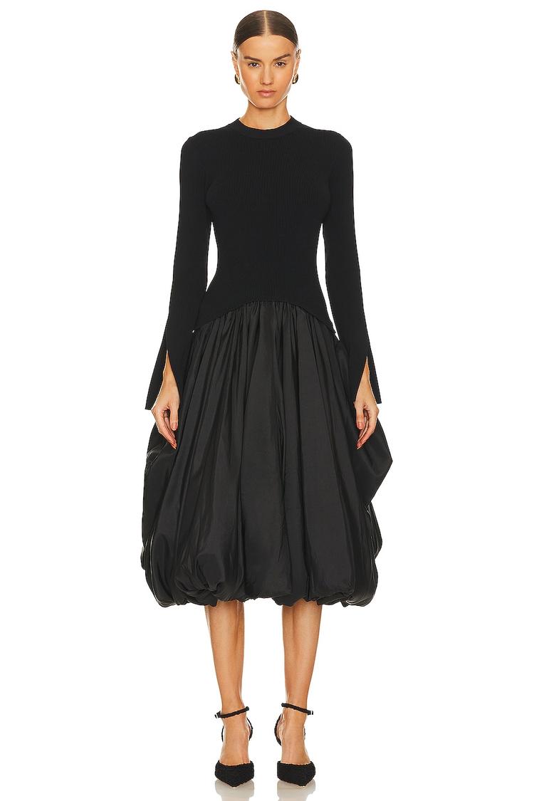 A compressive ribbed jersey bodice meets a voluminous taffeta skirt with a playful bubble hem in this midi dress. The fitted silhouette, crew neckline, and long sleeves offer a sleek and elegant profile, perfect for autumn and winter evenings. Sophistication shines through the pleated skirt detail, making it ideal for cocktail parties, date nights, and formal events. Crafted from a blend of rayon, elastane, polyester, and nylon, it combines comfort with refined style for versatile occasion wear.