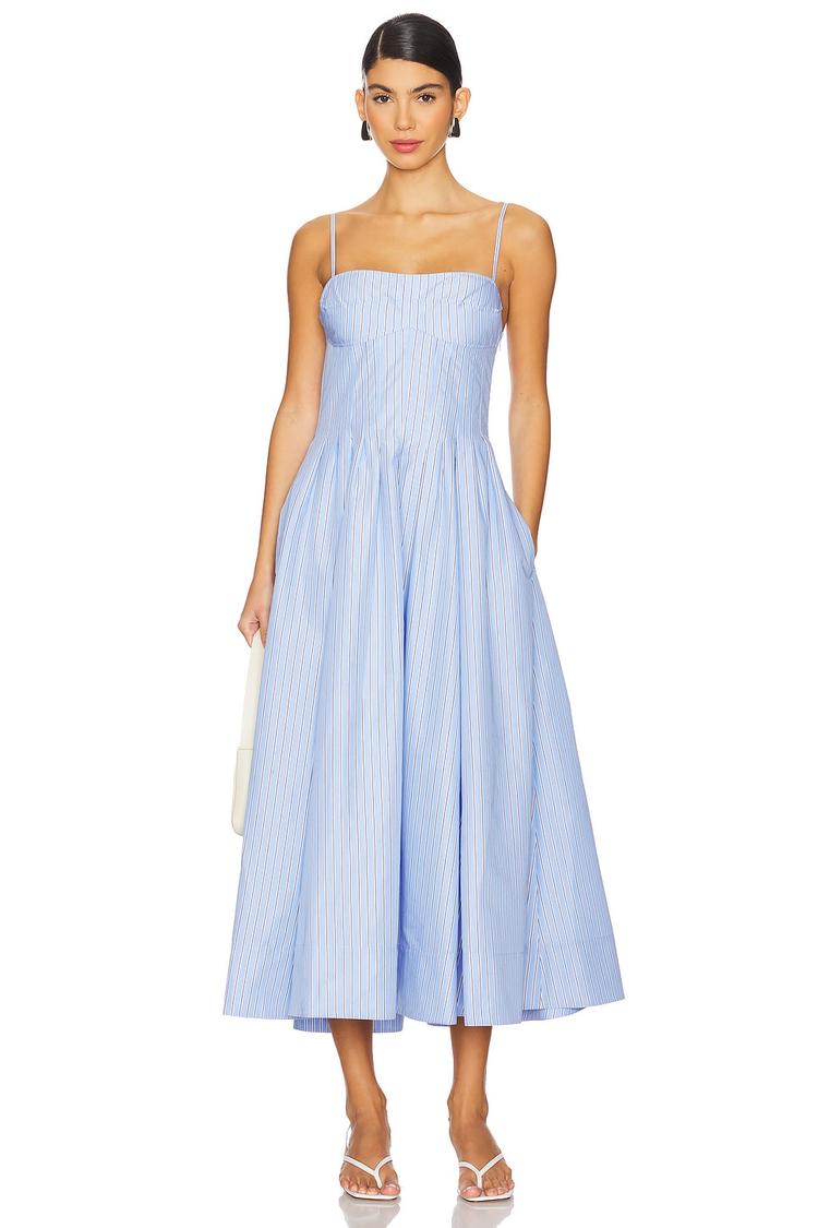 Soft matte light blue with white stripes creates a timeless A-Line midi dress featuring a straight neckline and delicate spaghetti straps. Crafted from midweight poplin cotton-polyester fabric, this dress offers regular fit comfort and adjustable straps for a custom feel. Concealed side zipper and handy side seam pockets add functional elegance. Its fully lined structure enhances wearability, perfect for spring and summer occasions like brunch, date nights, or vacation getaways. Classic and minimalist, this versatile piece balances style and ease with a clean hemline and subtle stripe pattern all over.
