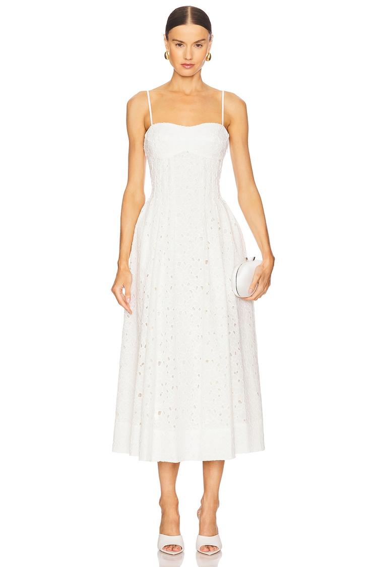 Soft cotton eyelet fabric and a fitted sweetheart neckline silhouette bring an airy, romantic feel to this midi dress. The adjustable spaghetti straps and hidden side zipper ensure a perfect fit, while the clean hemline and all-over eyelet embroidery add delicate texture. Ideal for spring and summer occasions, this classic dress transitions seamlessly from brunch to wedding guest events or date nights with its timeless elegance and practical side pockets.