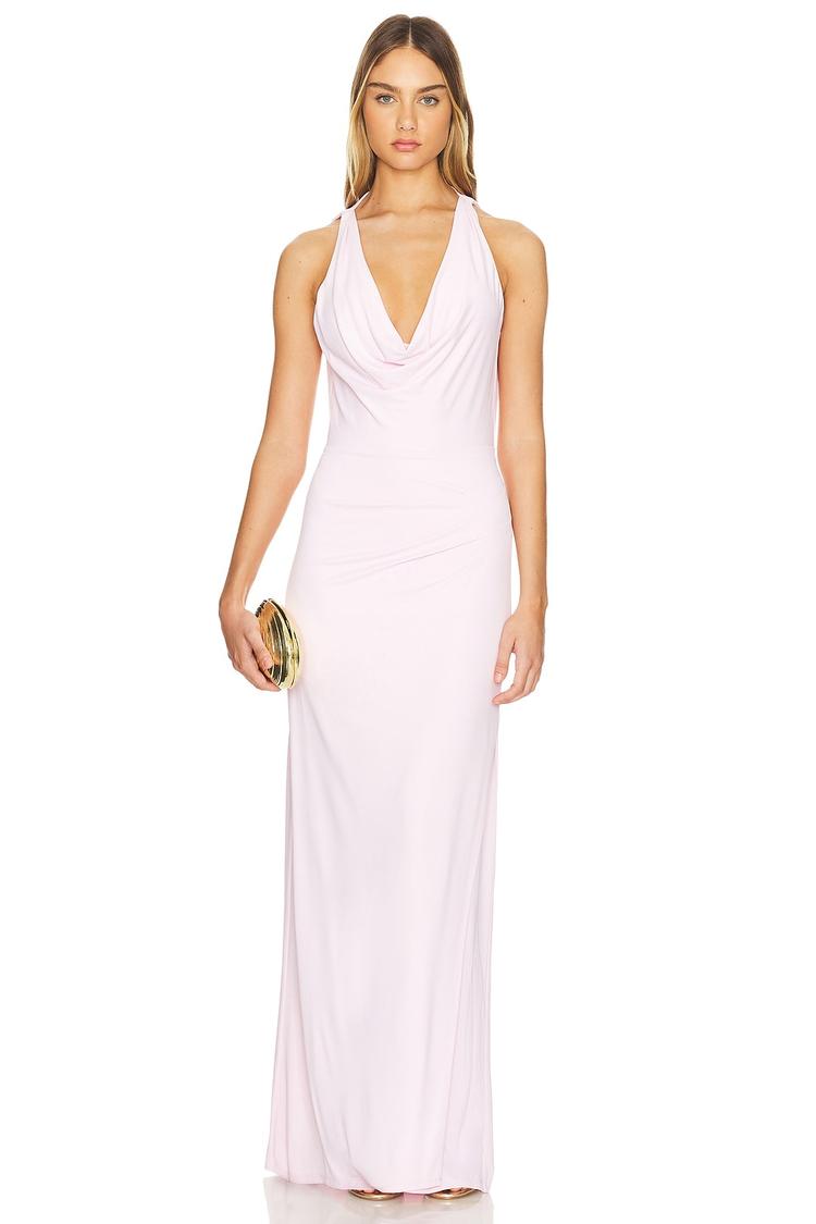 Soft matte pink fabric with a subtle sheen shapes this elegant column gown featuring a flattering cowl neckline and sleeveless strapless styling. The fitted silhouette skims the body smoothly, enhanced by delicate ruching on the front and side, while a daring side slit adds a sexy touch. An open back with a concealed zipper closure completes the refined look. Perfect for cocktail parties, formal events, and date nights, this fully lined rayon-spandex gown offers both comfort and sophistication across spring, summer, and all-weather occasions.