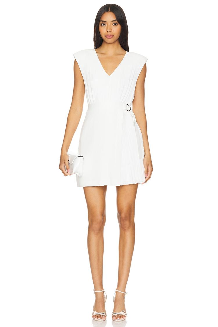 Crisp matte white crepe fabric with delicate pleated detailing defines this mini wrap dress featuring a flattering V-neckline and wide straps with padded shoulders for structure. The fitted silhouette, enhanced by an attached waist belt and concealed side zipper, offers an elegant and modern look perfect for cocktail parties, brunches, and date nights. Fully lined for comfort, this sophisticated piece balances contemporary style with refined simplicity, ideal for spring and summer occasions where polished yet effortless dressing is desired.