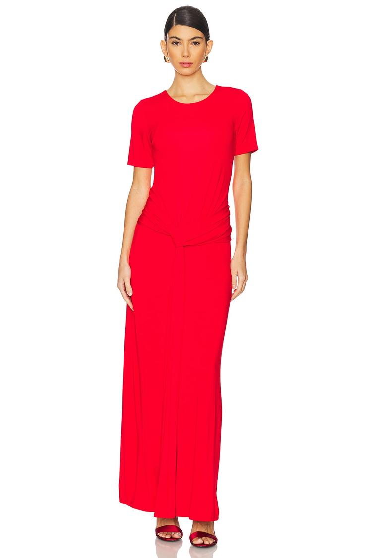 Soft heavyweight stretchy jersey fabric sculpts a fitted sheath silhouette in a striking red hue. The maxi length and short sleeves balance coverage with style, while a round neckline keeps it classic. A subtle front knot bow detail adds elegant charm to this minimalist gown. Fully lined with a concealed back zipper, it offers a smooth finish and easy wear. Ideal for formal events, cocktail parties, or a sophisticated date night, this gown delivers timeless sophistication and all-weather versatility.
