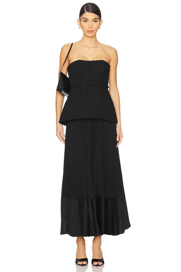A sleek silhouette featuring a fitted, boned bodice and a pleated midi skirt in matte black heavyweight crepe fabric creates a refined look. The straight neckline and sleeveless strapless styling add modern elegance, while the hidden back zipper and optional waist belt enhance fit and versatility. Perfectly tailored for cocktail events, date nights, or girls' nights, this dress offers sophisticated style with a flattering fit and luxurious fabric feel. The fully lined design ensures comfort and quality, making it a standout choice for elegant evening occasions.