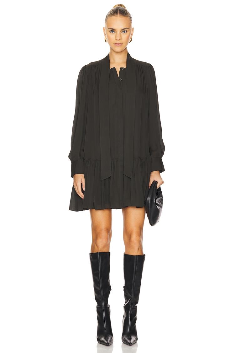 Soft chiffon silk crafts an elegant mini shift dress featuring long sleeves with buttoned cuffs and a classic collar neckline. The loose fit flows effortlessly with subtle ruffles along the hemline, creating graceful movement. This versatile black dress is ideal for cocktail parties, date nights, or stylish evening events. Its hidden front button closure and midweight fabric combine comfort with sophistication, making it a chic choice for spring and autumn wardrobes.