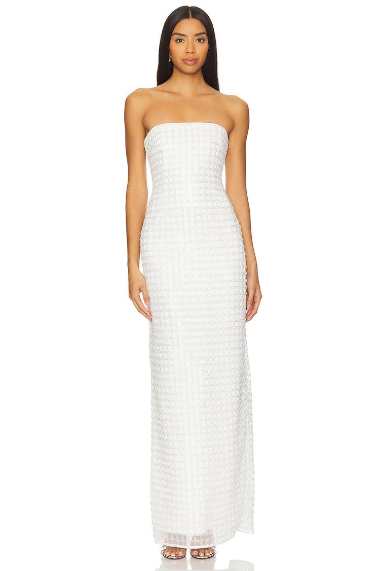 Tonal sequin embellishments shimmer across a sleek, strapless column silhouette in this fitted maxi gown. The concealed back zipper and back vent ensure comfort and ease, while the clean hemline adds to the gown's refined elegance. Crafted from nylon fabric and fully lined, this sophisticated piece is perfect for formal events, cocktail parties, and red carpet occasions. Its timeless white hue and elegant style make it a versatile wardrobe staple for special celebrations and upscale evenings.