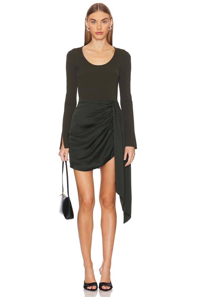 An elegant silhouette defined by a fitted ponte bodice and a satin skirt with draping accents, this mini wrap dress in matte dark green exudes modern sophistication. The round neckline and long sleeves offer a refined balance to the asymmetric hemline with a side slit, perfect for cocktail evenings, date nights, or stylish night outs. Crafted from a blend of rayon, elastane, acetate, and polyester, it ensures comfort and a flattering fit. The partial hidden side zip maintains sleek lines while the fully lined construction enhances wearability.