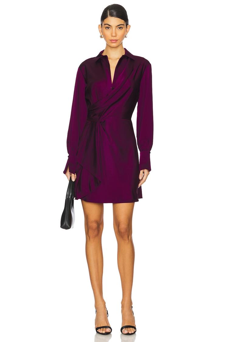 Matte dark purple satin fabric and a draped front design create an elegant mini wrap dress with a fitted silhouette. Featuring a flattering V-neckline, long cuffed sleeves, and a clean hemline, this lightweight dress is fully lined for a smooth fit. With a side zipper and dual hook-and-eye closures, it offers a sophisticated finish perfect for cocktail parties, date nights, or stylish evenings out. The modern draping detail at the front adds a chic touch to this versatile piece suitable for all weather seasons.