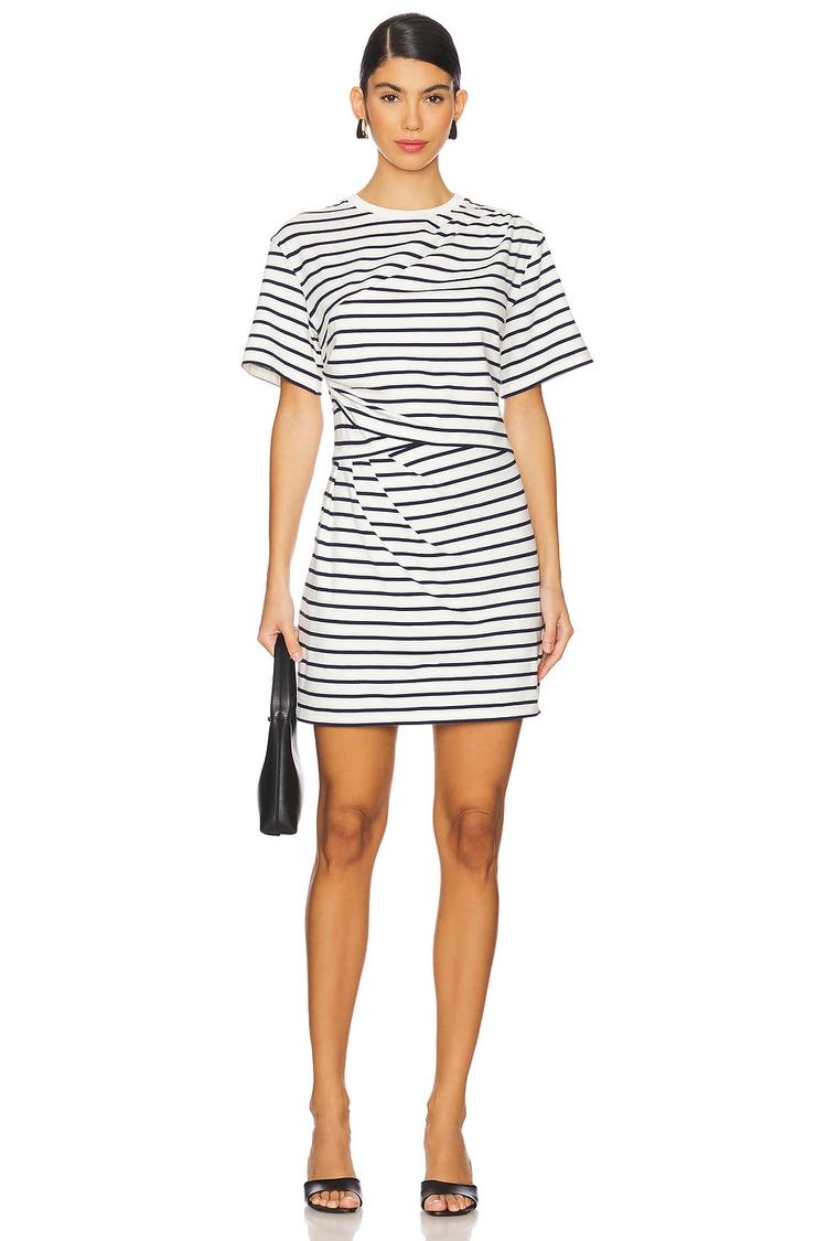 Lightweight cotton jersey with a classic black and white striped pattern creates a fresh, casual chic look in this slim-fitting mini T-shirt dress. The crew neckline and half sleeves keep it relaxed, while the ruched side adds subtle texture and shape to the silhouette. Its pull-on styling and clean hemline emphasize effortless wearability, making it perfect for everyday errands, brunch dates, or casual outings in spring through autumn. Combining minimalism with comfort, this versatile dress balances simplicity and design details with ease.
