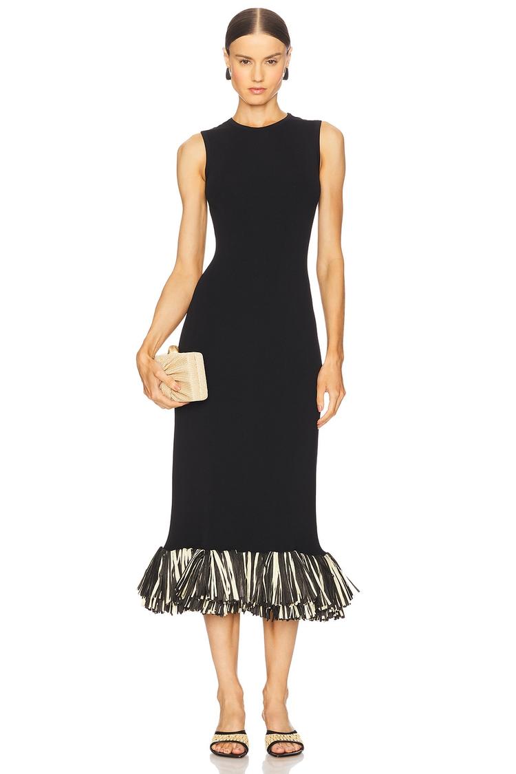A heavyweight knit sheath dress with a sleek high neckline and sleeveless cut, designed to hug the body’s silhouette elegantly. The standout ruffled hem crafted from woven paper adds a unique textural contrast in beige, creating movement and interest. The pull-on style with ribbed trim ensures comfort and effortless wearability. Versatile for cocktail parties, date nights, and sophisticated evenings, this modern minimalist dress blends refined style with unexpected artisanal details.