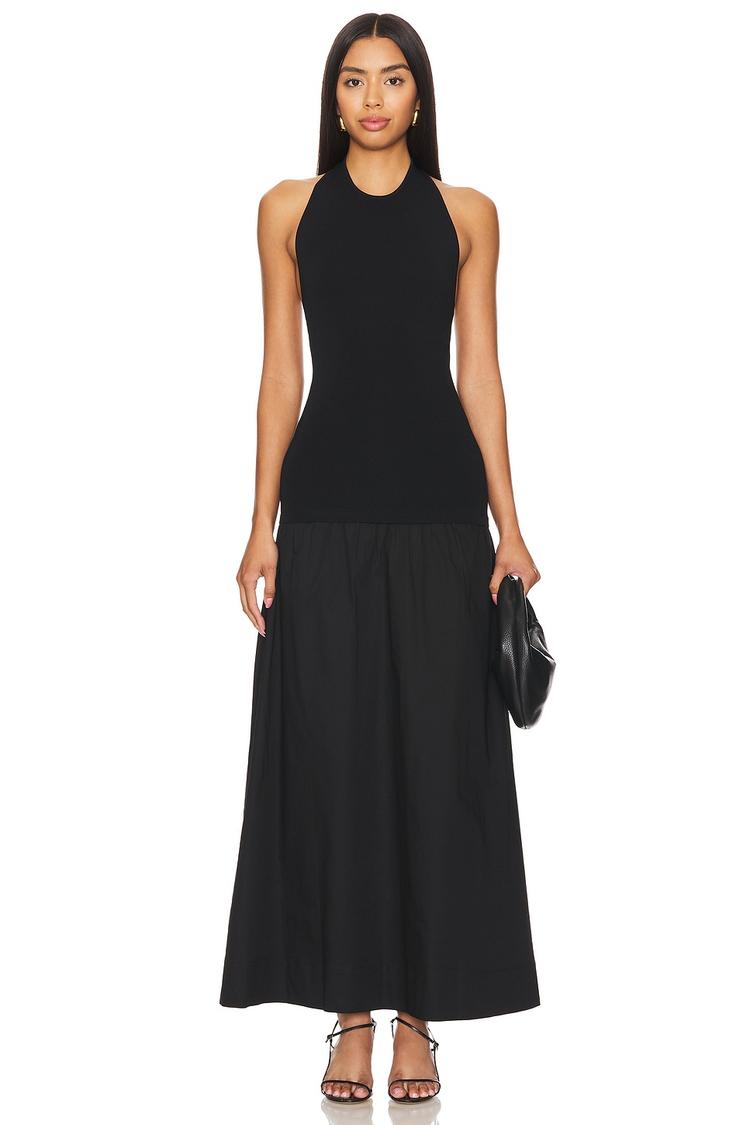 A sleek matte black column silhouette defines this maxi dress, blending a fitted ponte upper with a flowing poplin skirt for a modern minimalist look. The halter neck and open back create an elegant, sleeveless style perfect for spring to autumn wear. Its slim fit and clean hemline enhance the silhouette's graceful lines, while the tie-up closure adds subtle detail. Ideal for brunches, date nights, or cocktail events, this versatile dress combines comfort with refined sophistication in a blend of viscose, cotton, and nylon fabrics.