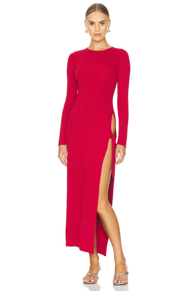 A sleek column silhouette meets a vibrant matte red hue in this Junjo Long Sleeve Knit Dress, crafted from a soft viscose-nylon blend for a smooth, fitted feel. The maxi length and long sleeves offer elegant coverage while a high side slit with a tie-up accent adds alluring movement and modern sophistication. Perfect for autumn and winter evenings, this minimalist dress transitions effortlessly from cocktail parties to date nights and chic night outs. Its clean hemline and round neckline maintain a refined finish, making it a versatile piece for polished, contemporary wardrobes.