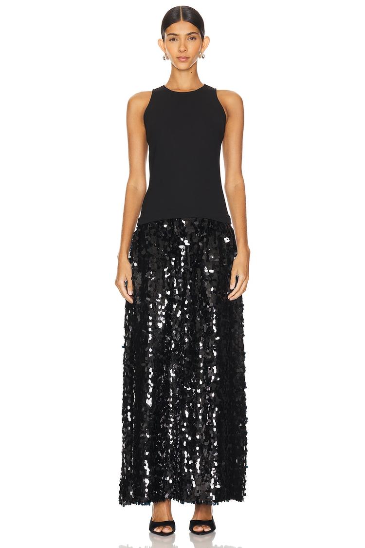A sleek crepe bodice meets a sparkling sequin maxi skirt in this elegant shift dress, perfect for upscale cocktail events, semi-formal gatherings, or formal occasions. The high neckline and sleeveless cut enhance its minimalist sophistication, while the hidden back zipper ensures a smooth silhouette. Crafted from polyester crepe with a fully lined interior, this slim-fitting dress combines comfort with refined sparkle, making it a standout choice for any special evening.