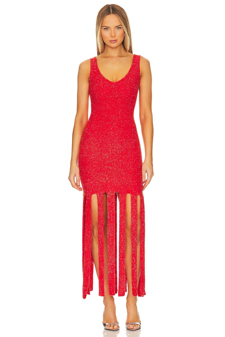 Soft knit fabric with a shimmering finish gives this fitted sheath dress a bold, modern edge. The U-neckline and wide straps frame the upper body elegantly, while the striking midi hem features long vertical slits that add movement and allure. This red shimmer dress is perfect for cocktail parties, date nights, or evenings out when you want to stand out with confident, sexy style.