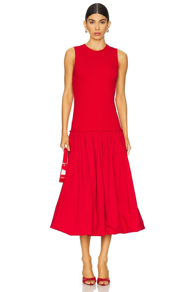 A vibrant red fit and flare midi dress features a ribbed knit sleeveless top with a round neckline, seamlessly transitioning into a full poplin skirt with a distinctive bubble hem ruffle detail. Crafted from a blend of viscose, nylon, cotton, and elastane, this dress offers a comfortable yet structured fit. Its slip-on design and covered back ensure ease and versatility. Ideal for casual outings, brunch dates, or relaxed evenings, this modern casual chic piece captures effortless style and seasonal freshness for spring and summer wardrobes.