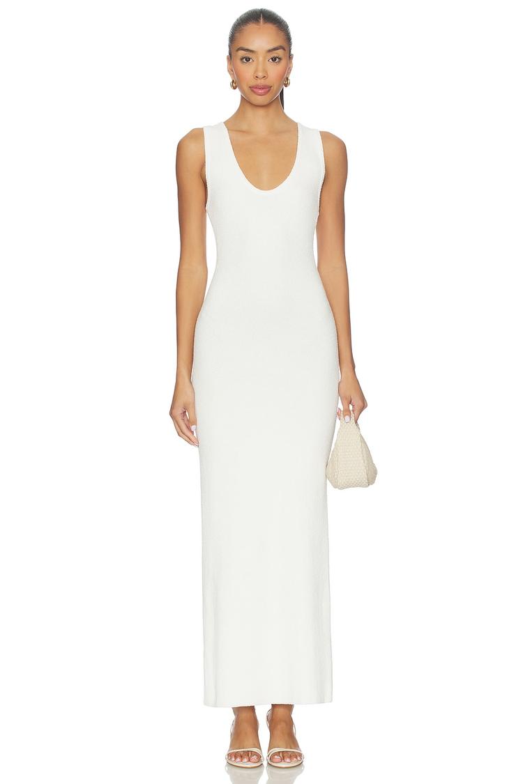 Clean lines and a sleek scoop neck define this white maxi slip dress, crafted from a soft cotton and nylon knit blend that offers a close, body-skimming fit. Sleeveless with a covered back, it combines minimalist elegance with sophisticated simplicity, making it an ideal choice for summer and spring occasions such as date nights, cocktail parties, or stylish evenings out. The slip-on design adds effortless wearability, while the clean hemline completes the streamlined silhouette for timeless versatility.