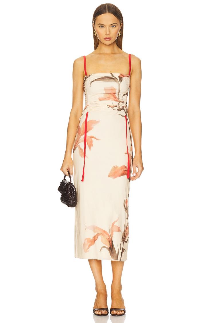 Soft jersey fabric and a flattering fitted slip silhouette create an effortlessly chic look with its ruched detailing and subtle drawstring accents. The midi length and square neckline balance sophistication with a touch of ease, while delicate peach floral prints bloom across the cream base. Ideal for spring and summer, this versatile dress suits brunches, date nights, and cocktail occasions alike, combining comfort with elegant style.