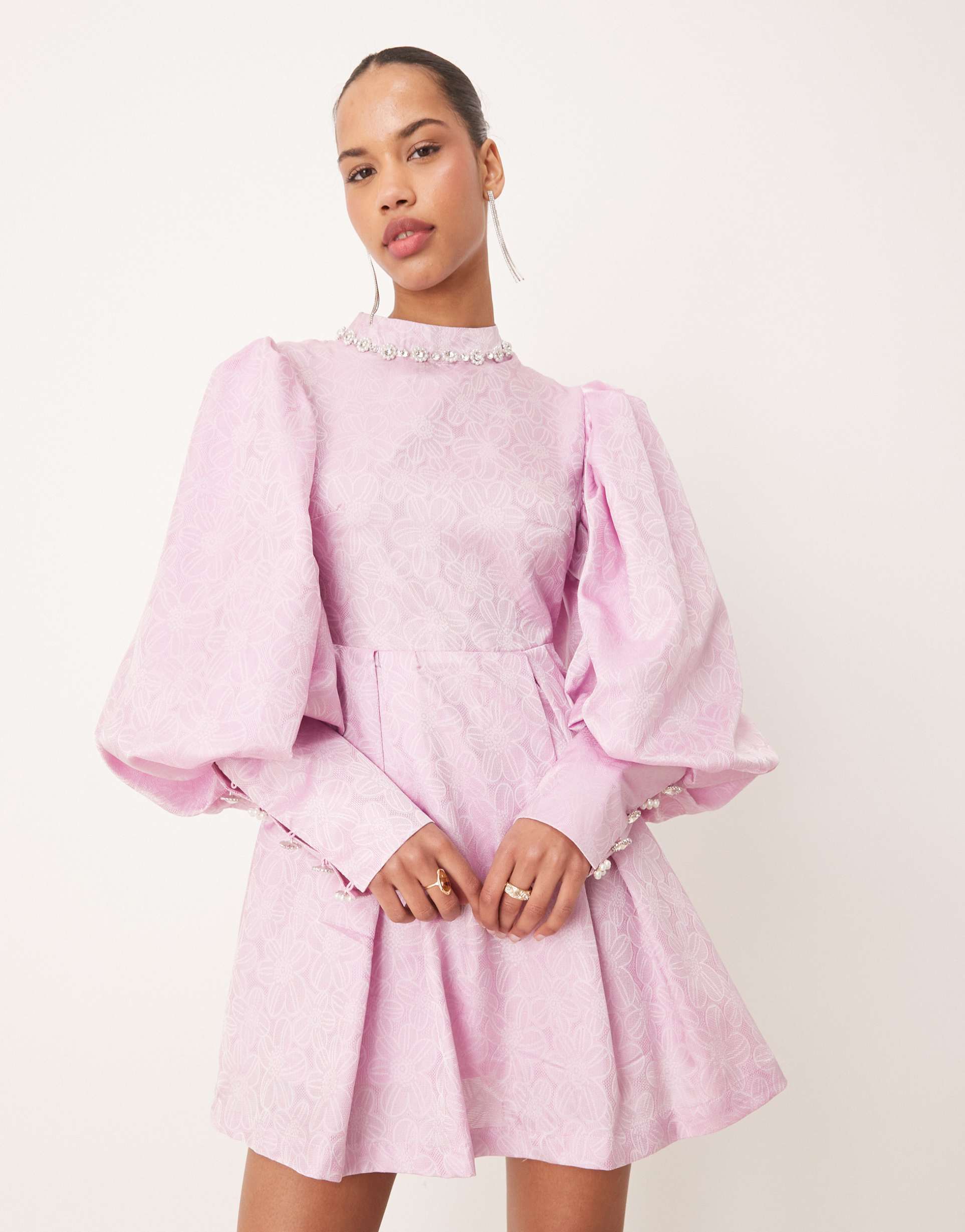 Intricately woven jacquard fabric in a soft dusty pink hue brings vintage romance to this mini A-line dress. The high neck and dramatic balloon sleeves add a sophisticated silhouette, while delicate rhinestone and faux-pearl embellishments lend sparkling elegance throughout. With a regular fit and clean hemline, this structured dress offers a polished look perfect for spring and autumn brunches, date nights, or cocktail events. The back zipper closure ensures a seamless finish to this timeless piece.