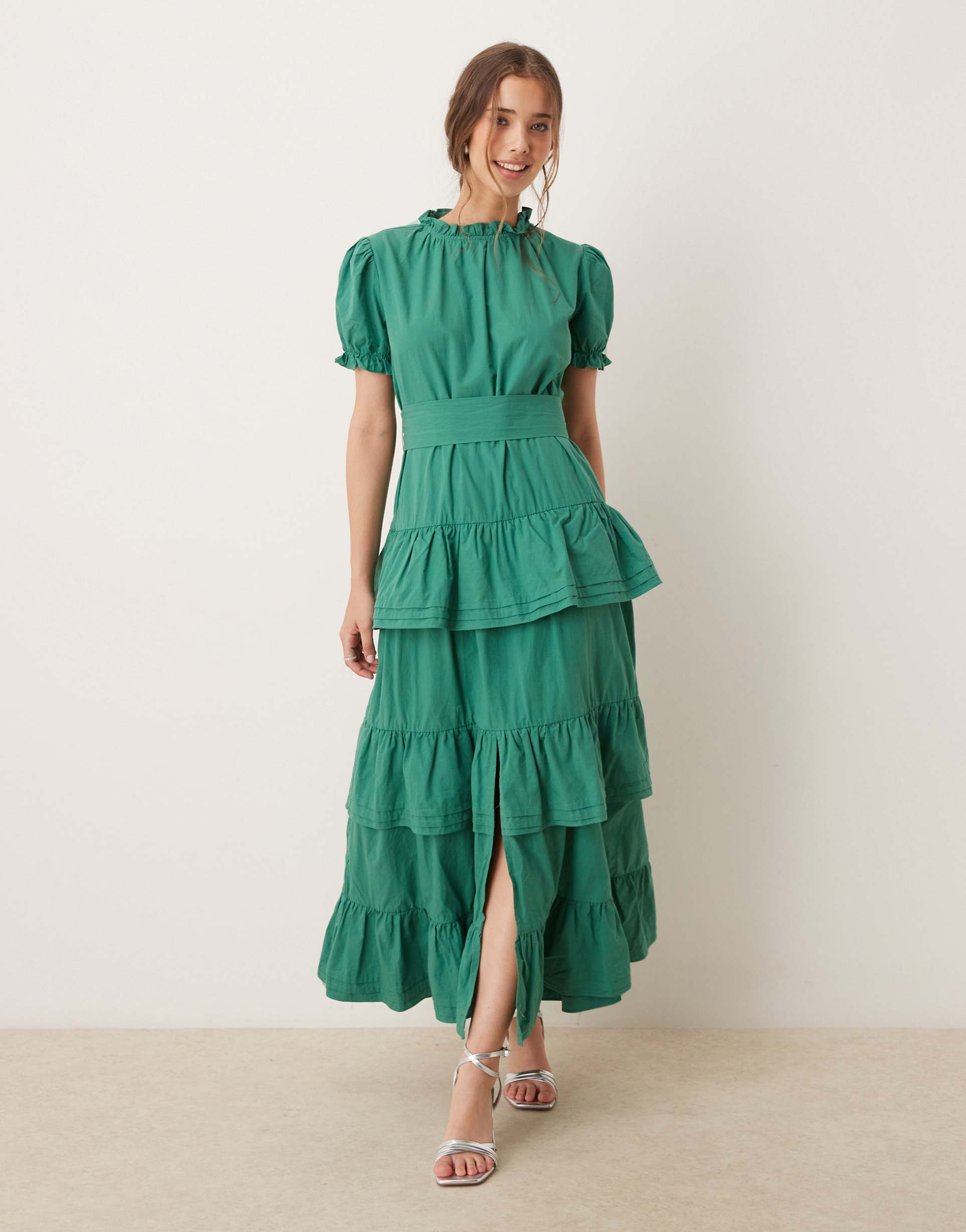 Soft cotton fabric and a romantic tiered silhouette define this maxi dress with a high neckline and puffed half sleeves. The regular fit and elegant ruffled tiers flow gracefully to a slit hemline, perfect for warm spring and autumn evenings. The tie-back closure adds a delicate back detail, enhancing its classic yet sophisticated style. Ideal for cocktail parties, date nights, and formal occasions, this green dress offers timeless charm with comfortable everyday wearability.