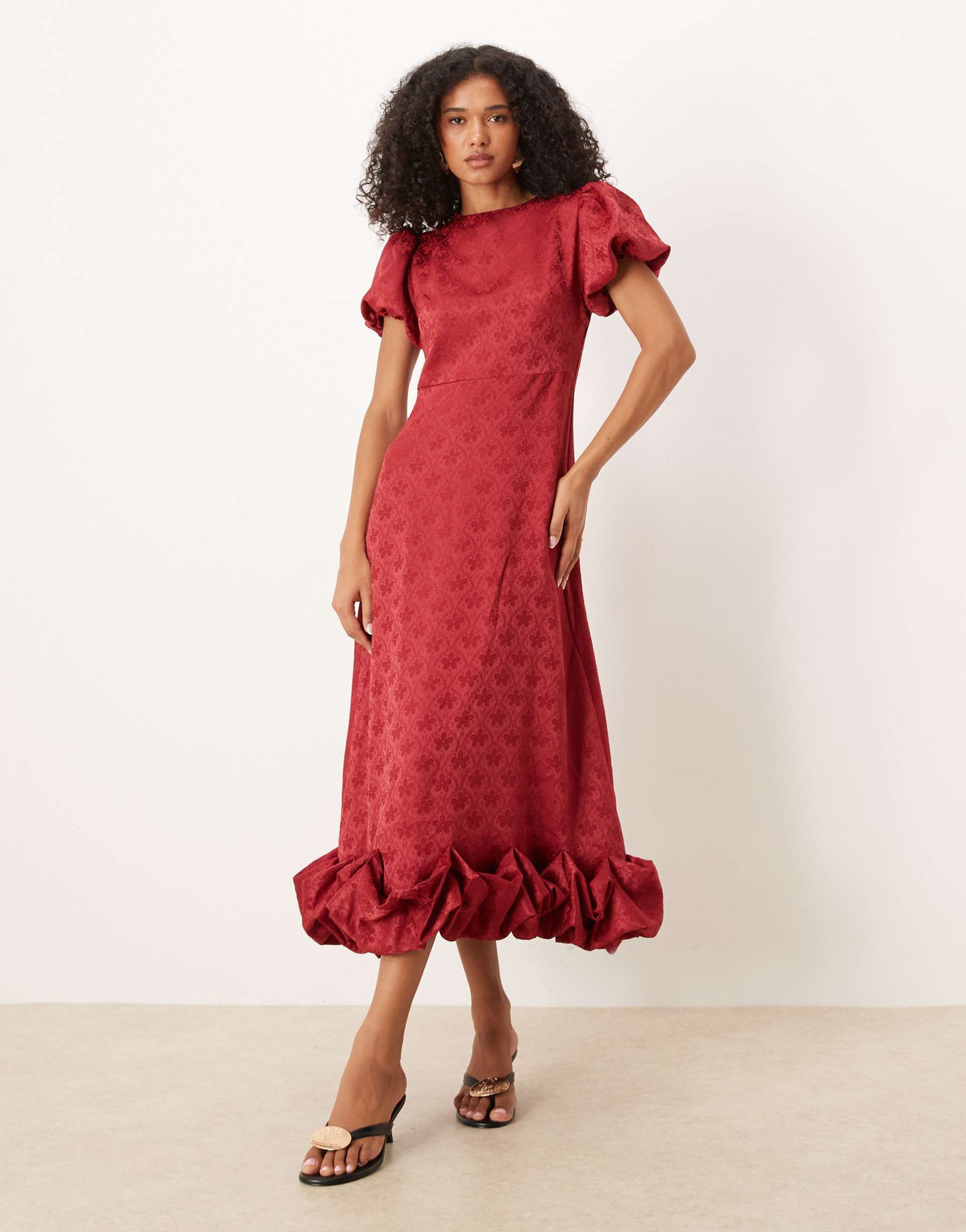 Intricate jacquard fabric in a matte red hue defines this elegant shift dress, featuring a classic round neckline and voluminous puffed half sleeves. The silhouette flows into a striking bubble hem that adds unique volume and movement to the maxi length. Designed with a regular fit and a discreet back closure, this dress blends sophistication with comfort. Ideal for date nights, cocktail parties, and formal events, its timeless style and textured fabric make it a standout piece in any wardrobe.