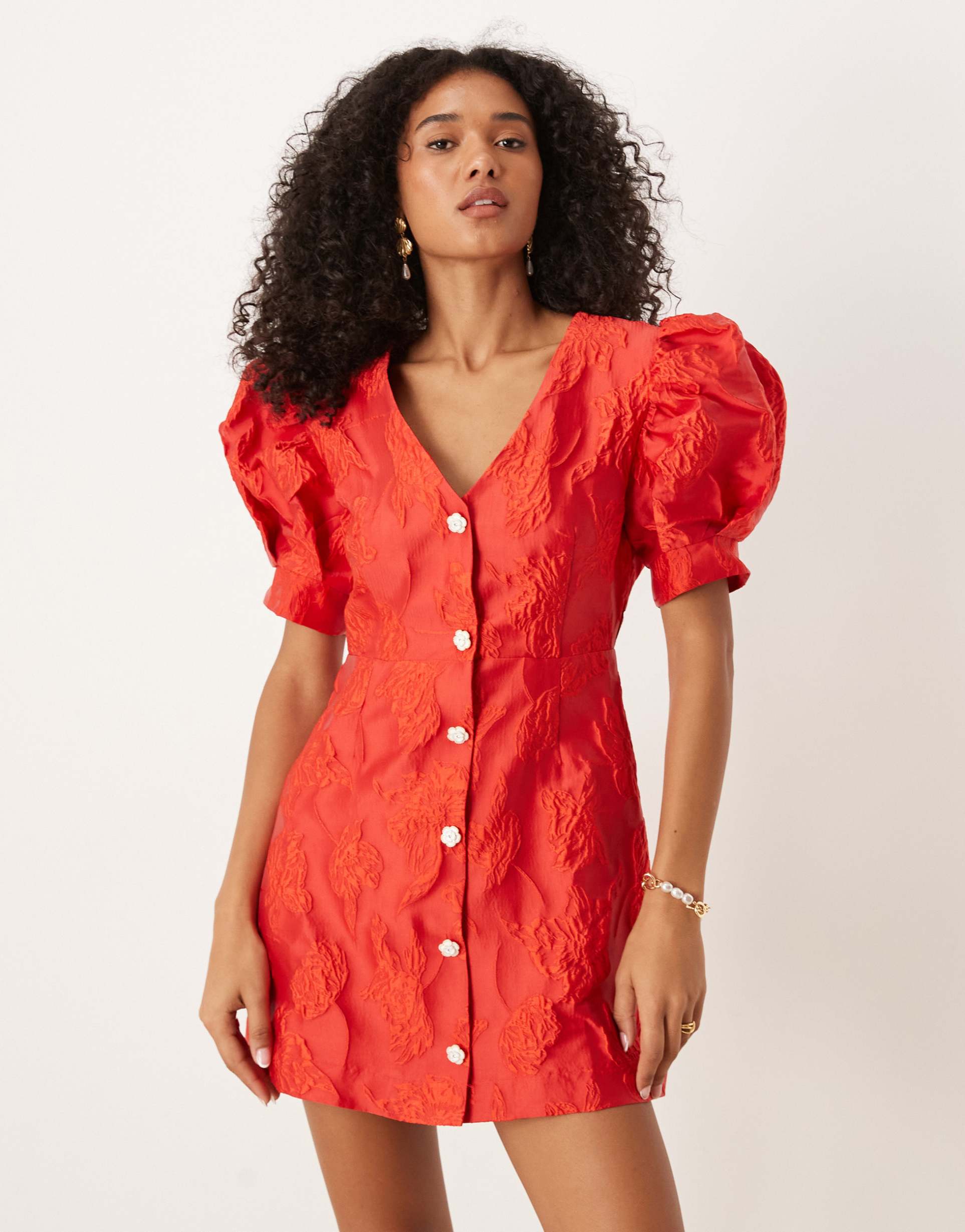 Bold matte red jacquard fabric with intricate texture and sparkling rhinestone buttons define this chic mini shift dress. The puffed half sleeves and V-neckline add a trendy yet elegant flair, perfectly balanced by a clean hemline. Designed with a regular fit and button-up front, it offers comfortable wear and a flattering silhouette. Ideal for spring and summer occasions such as brunch, date nights, or lively nights out, this polyester dress combines statement style with easy sophistication.