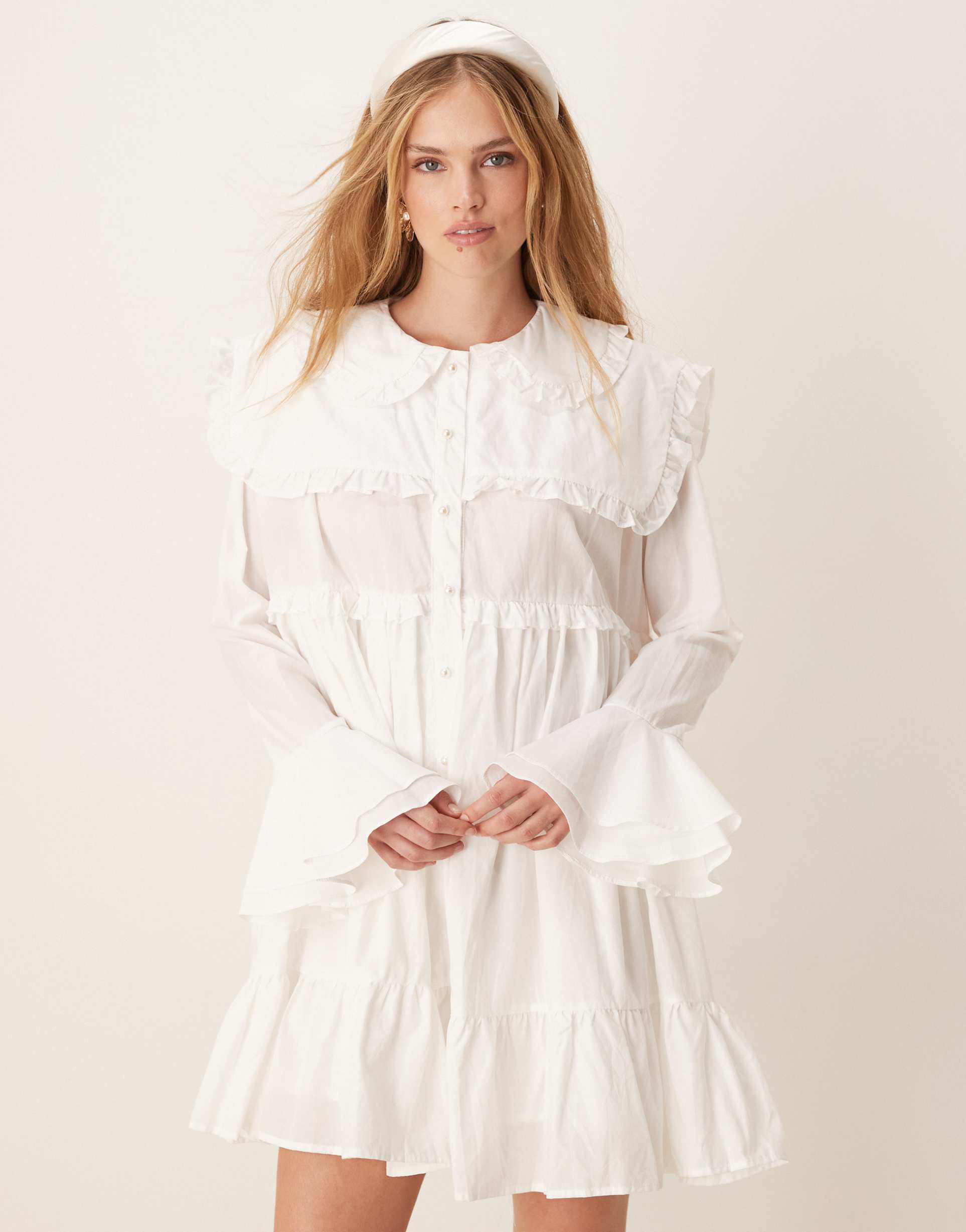 Soft cotton and modal blend fabric shapes this babydoll mini dress featuring a tiered silhouette and romantic Peter Pan frill collar. Long sleeves with ruffle detailing and a button placket add delicate charm, while the regular fit and ruffled hem create an effortless, flirty look. Ideal for spring and summer days, this dress suits casual outings, brunches, and date nights with its cute, feminine style and comfortable fabric blend.
