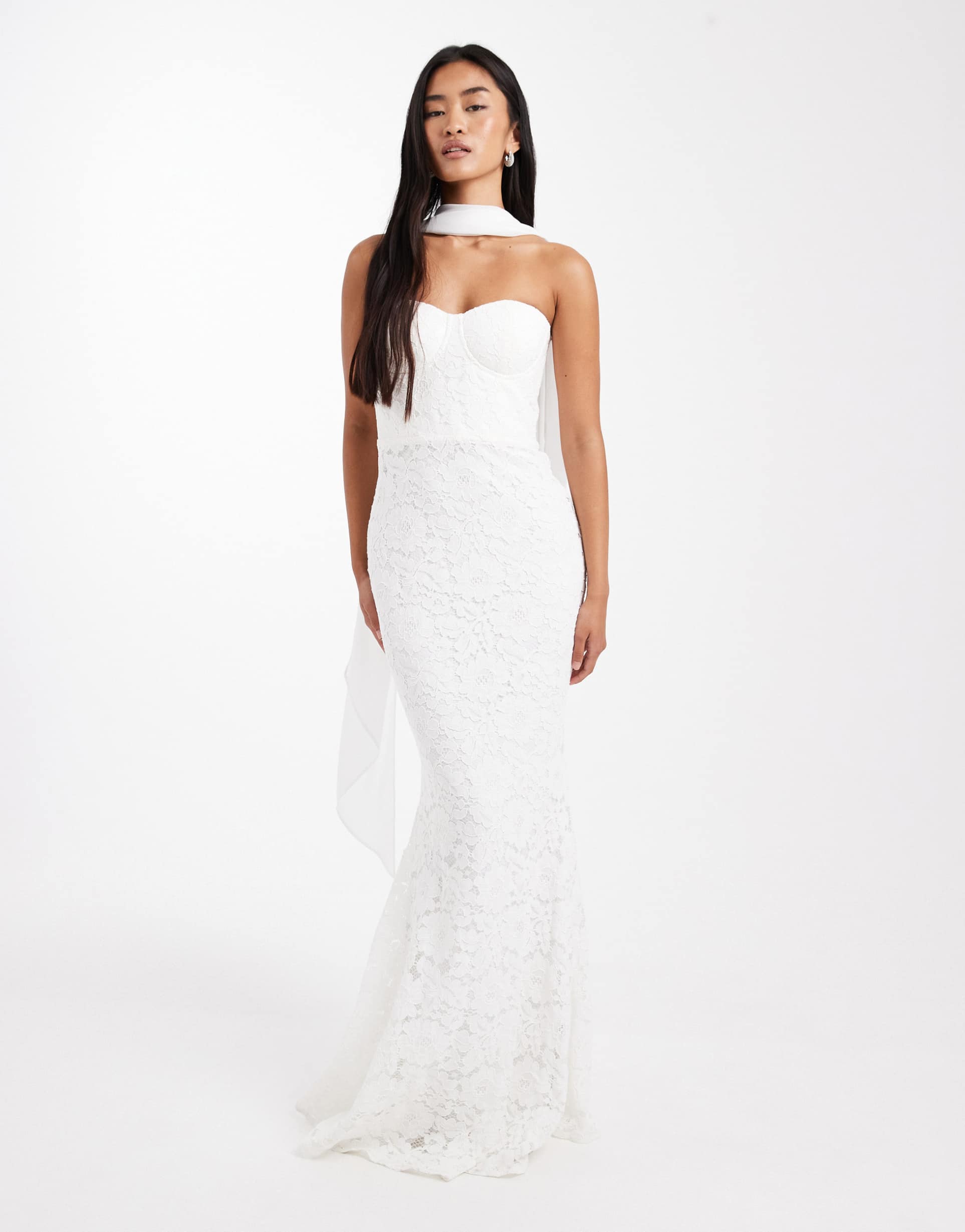 SIX STORIES BRIDAL LACE BANDEAU SCARF NECK MAXI DRESS IN WHITE