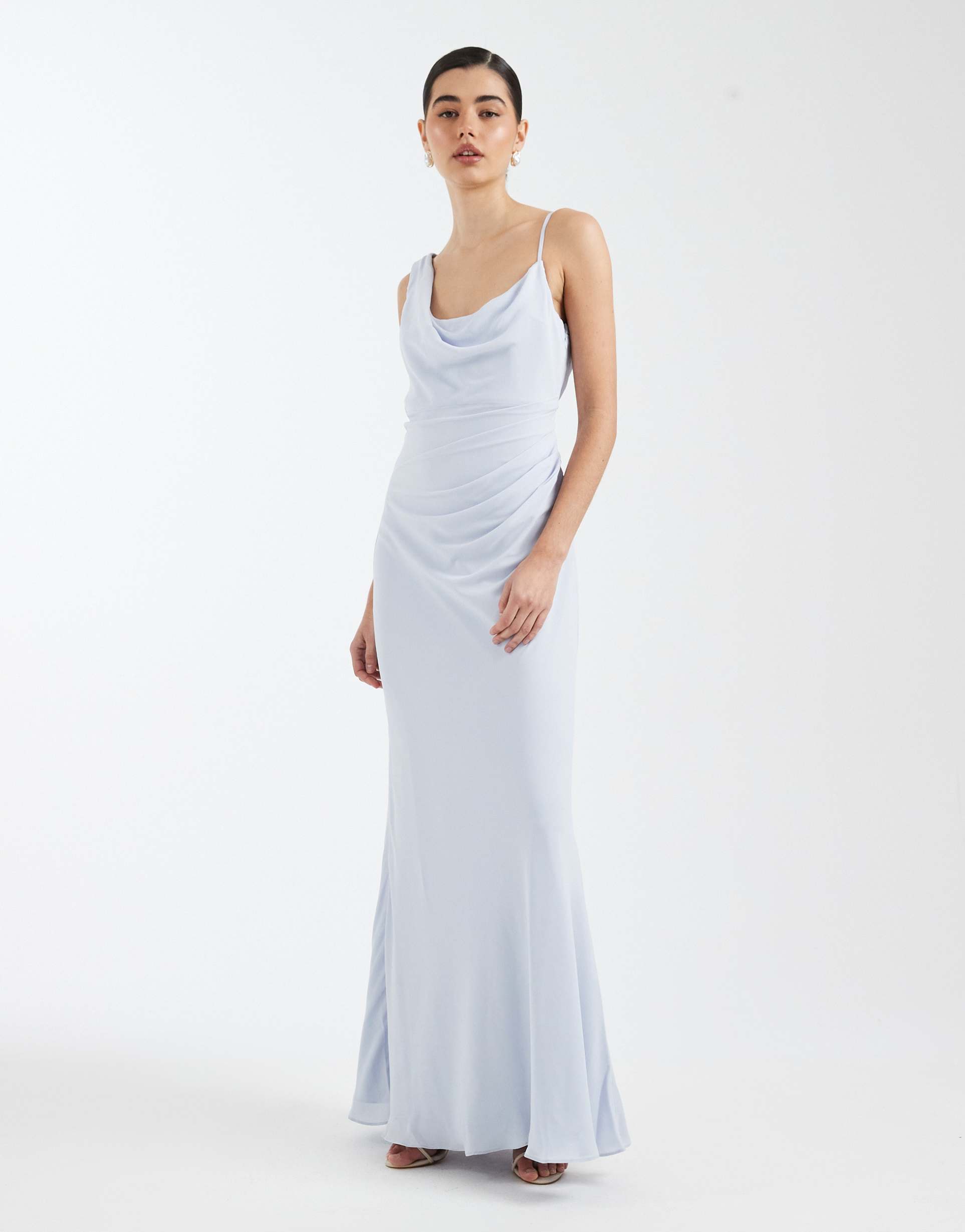 SIX STORIES BRIDESMAID CREPE ASYMMETRIC COWL NECK MAXI DRESS IN PALE BLUE