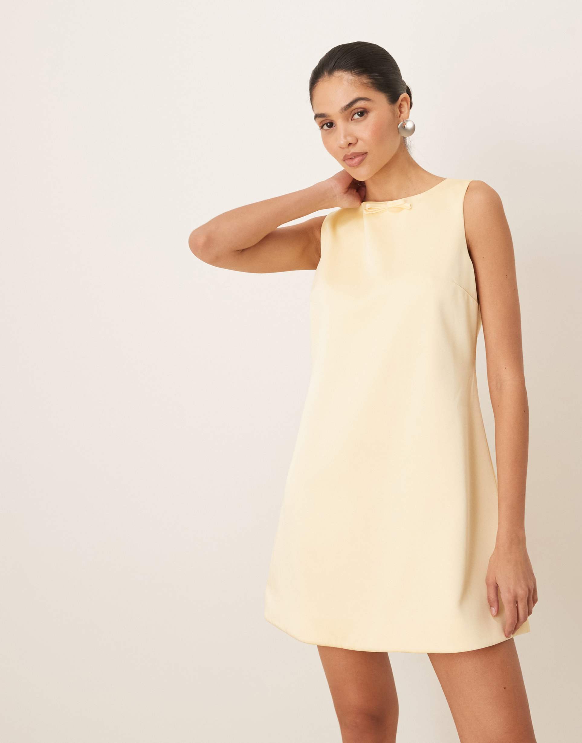 Glossy satin fabric and a sleek mini shift silhouette combine for effortless style in this lemon yellow dress. Featuring a classic round neckline and sleeveless cut, it offers a regular fit that drapes smoothly. The clean hemline and subtle bow detail at the back add refined charm. Ideal for spring and summer, this versatile dress suits casual outings, brunch dates, and relaxed evening occasions with a minimalist, timeless appeal.