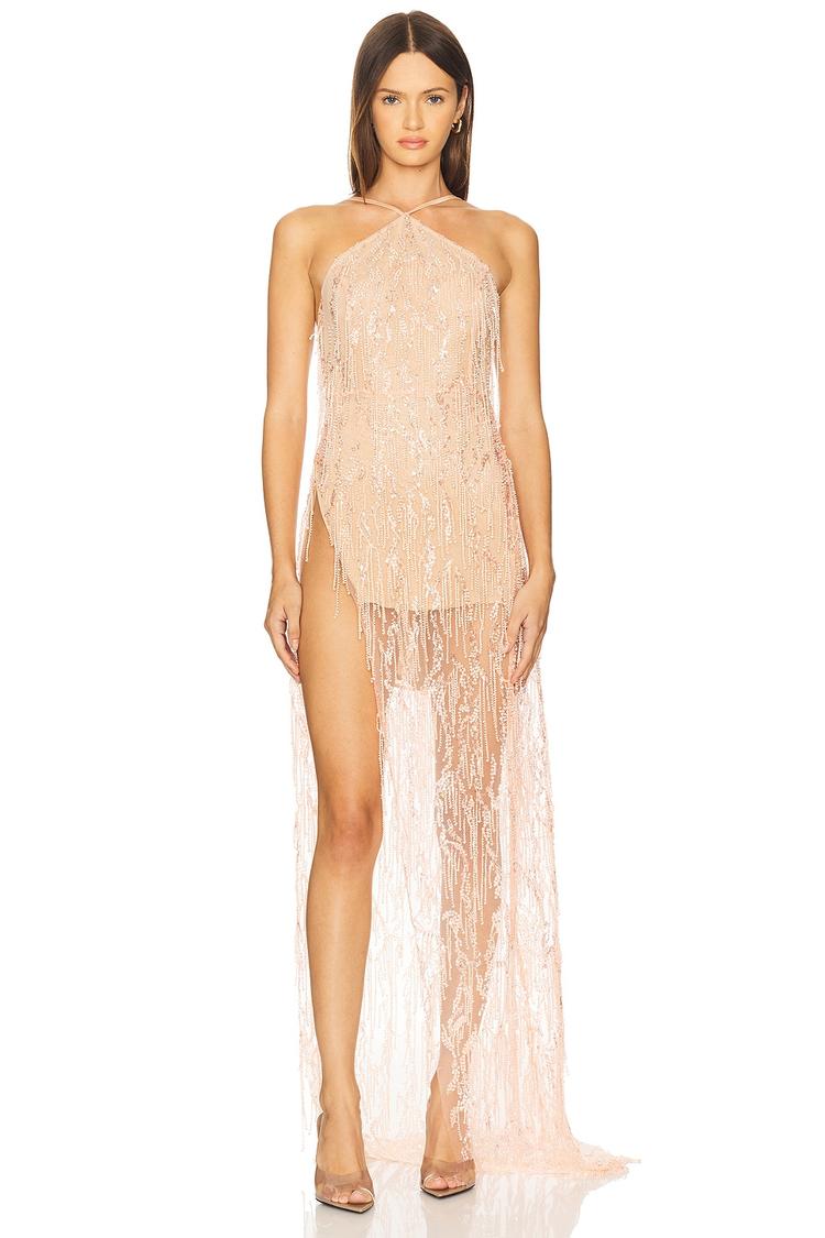 Shimmering with dusty rose sequins and beads, this slim-fitting column gown features an elegant halter neckline and an asymmetric sheer hem that flows beautifully. Crafted from midweight mesh with nylon and polyurethane for a subtle stretch, its concealed back zipper ensures a sleek silhouette. Perfect for cocktail parties, semi-formal events, or nights out, this gown merges trendy design with timeless elegance for standout style.