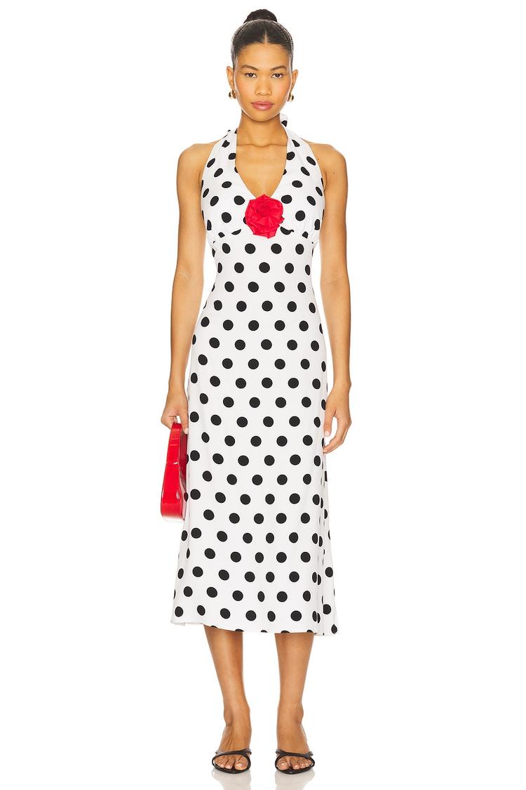 Sunlit afternoons and elegant evenings come alive in this classic column maxi dress featuring a playful black polka dot pattern on a crisp white background. Crafted from midweight sateen polyester, it offers a slim fit with a flattering halter neckline and sleeveless styling. The clean hemline and hidden back zipper ensure a sleek silhouette, while the striking red rosette applique at the front adds a charming focal point. Ideal for brunch, date nights, or cocktail events, this dress balances timeless elegance with a fun, modern twist.