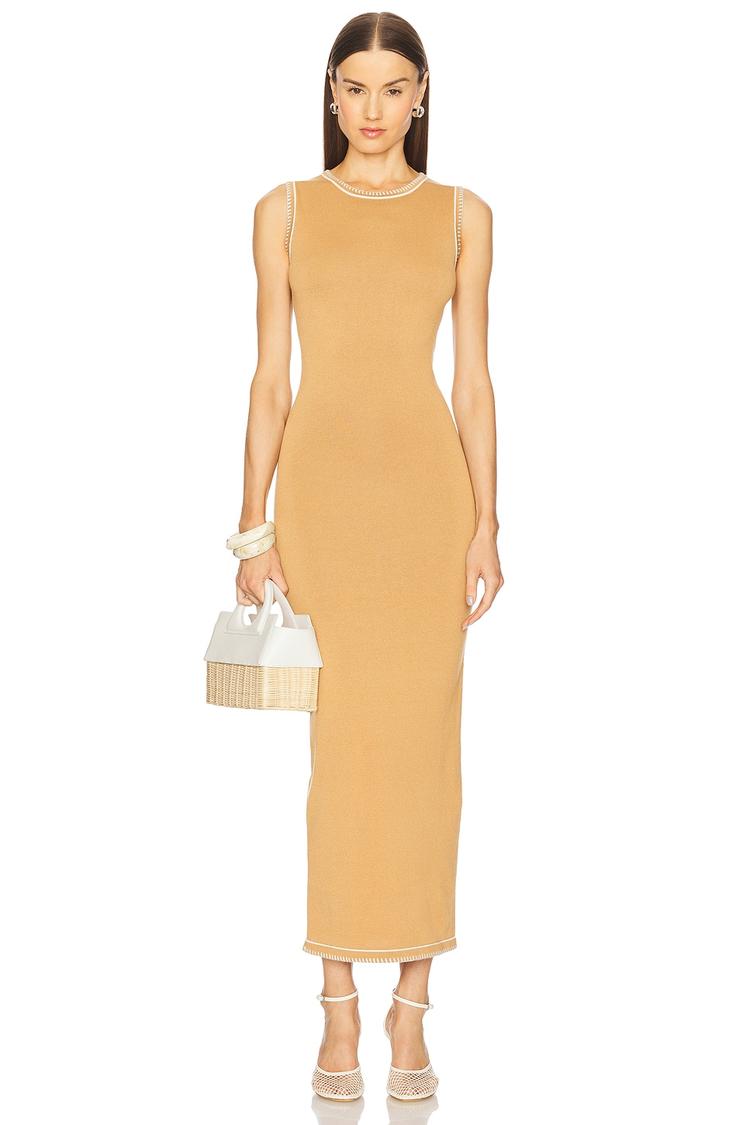 A sleek column silhouette meets a matte tan hue in this fitted maxi dress crafted from midweight polyester knit. Featuring a sleeveless design with wide straps and a classic crew neckline, it offers clean lines and hand-stitched edging for subtle texture. The pull-on styling ensures effortless wear, perfect for all seasons. Its minimalist elegance makes it ideal for date nights, night outs, or relaxed brunches where understated sophistication is key.