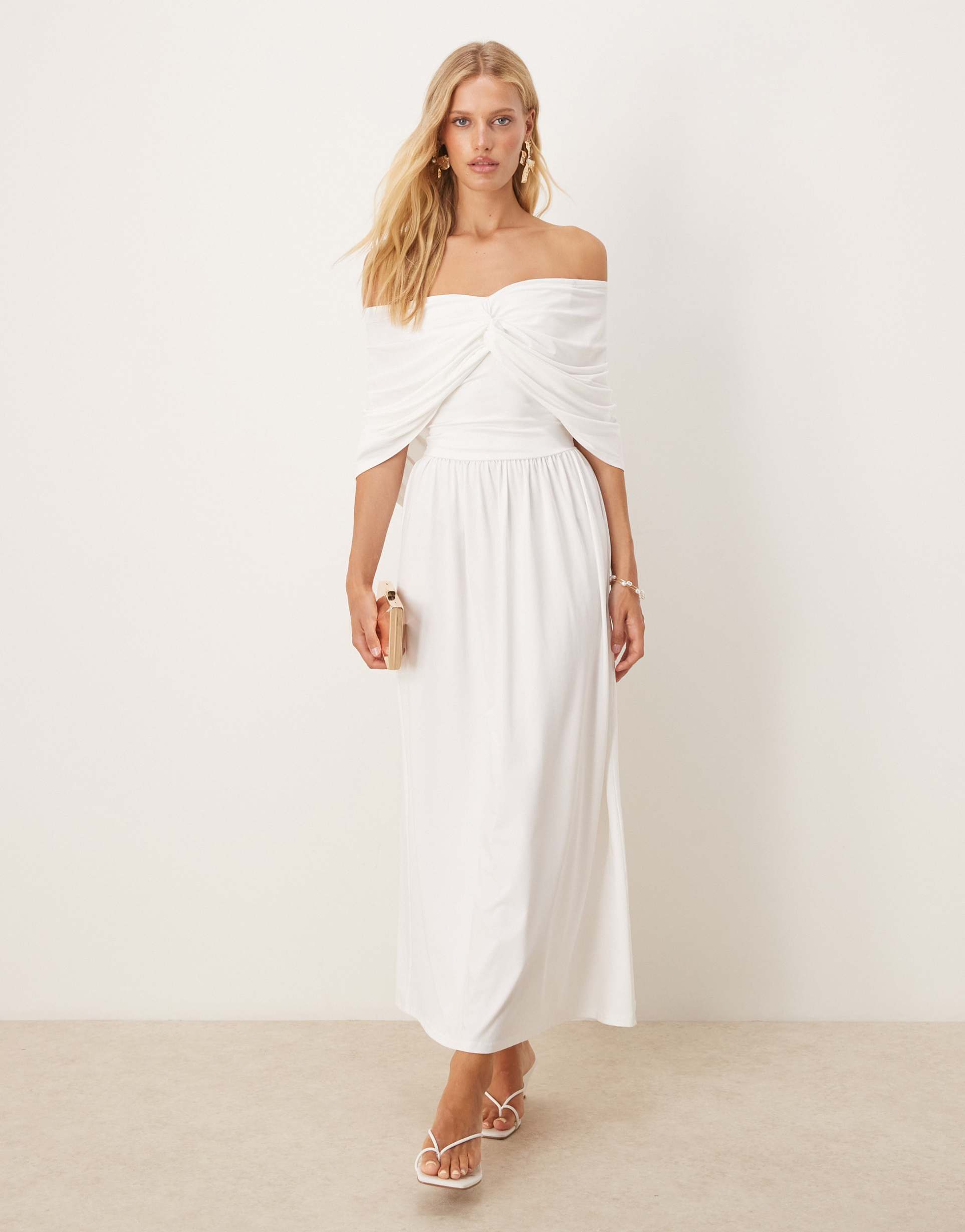 Soft polyester blend fabric with a hint of elastane offers gentle stretch in this elegant shift maxi dress. The off-shoulder bardot neckline and wide strap sleeves feature subtle ruching and twist details, creating a flattering silhouette with a dropped waist. Its clean white hue and classic design make it perfect for spring and summer brunches, date nights, or cocktail events. The regular fit enhances comfort while maintaining a sophisticated look that transitions effortlessly from day to evening occasions.