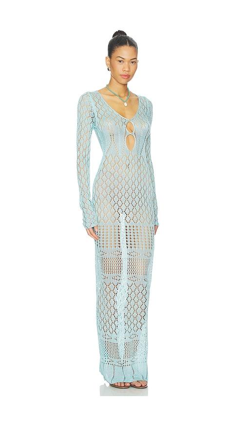 SNDYS LONG SLEEVE CROCHET MAXI DRESS IN BABY BLUE.