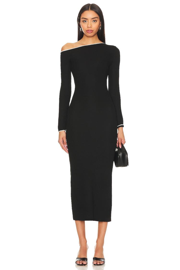 Sleek and refined, this black knit jersey sheath dress features a flattering off-shoulder neckline and long sleeves with contrasting white ribbon trim at the cuffs. Its fitted silhouette and midi length create an elegant, minimalist look perfect for cocktail parties, date nights, or evening events. Crafted from a soft polyester blend with antibacterial fiber, the dress offers comfortable pull-on styling. Clean lines and subtle design details make this piece a sophisticated choice for autumn and winter wardrobes, combining timeless style with modern comfort.