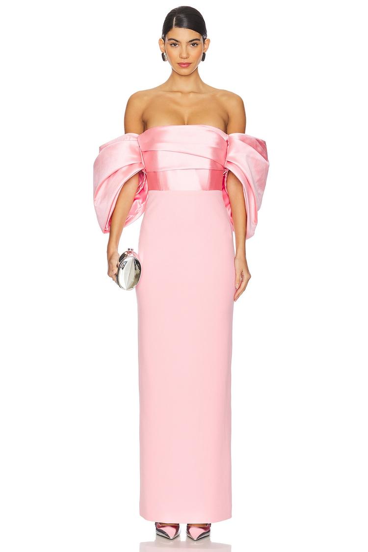 Structured off-shoulder sleeves with ruffled detail elevate this fitted column maxi in matte pink satin and crepe polyester. The straight neckline and clean hemline emphasize a sleek silhouette, perfect for cocktail parties, semi-formal evenings, or formal events. Hidden back zipper closure and full lining add sophistication and comfort, making it a refined choice for special occasions across seasons.