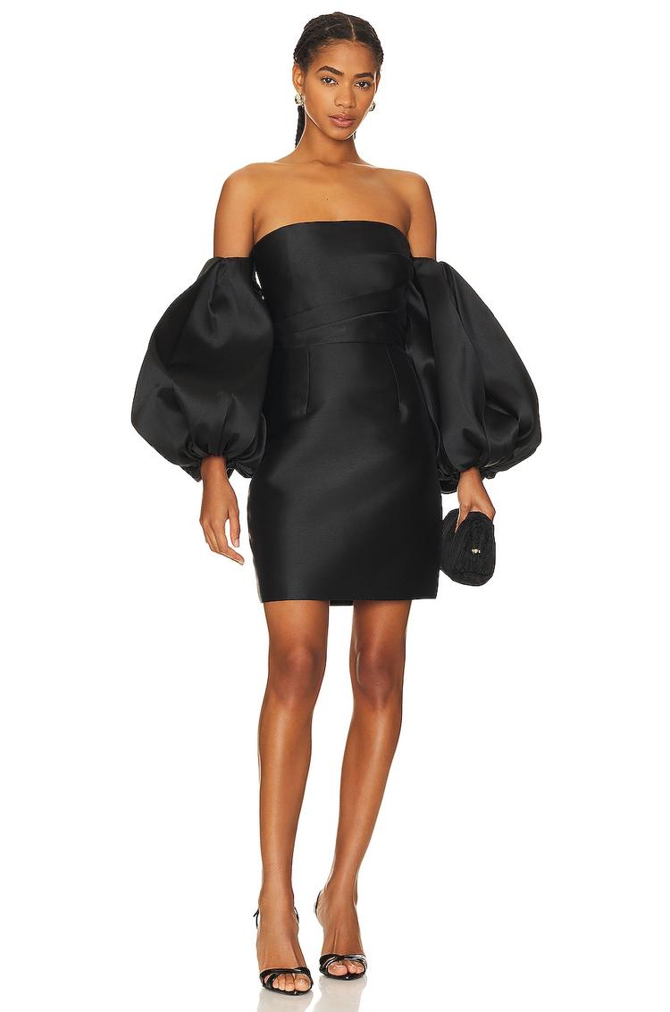 Sleek and sophisticated, this matte black mini shift dress features a straight neckline and dramatic long balloon sleeves that create an elegant silhouette. Crafted from a midweight cotton blend twill with a subtle sheen, it offers a fitted shape complemented by a concealed back zipper for a seamless finish. The off-shoulder design adds a touch of modern allure, making it an ideal choice for cocktail parties, date nights, or an upscale evening out. Fully lined for comfort, this dress balances statement sleeves with a clean hemline for timeless style.