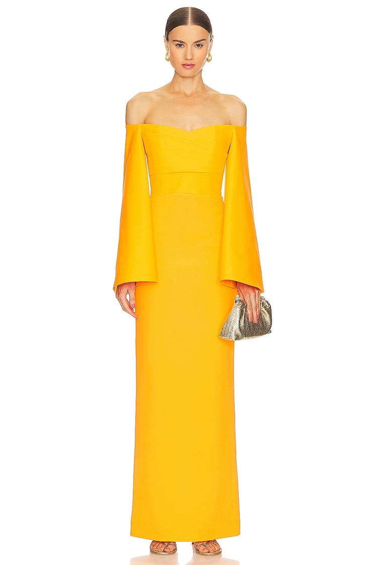 A matte yellow crepe column maxi dress with an off-shoulder neckline and long wide sleeves offers a modern, sophisticated silhouette. The fitted boned bodice and hidden back zipper ensure a sleek fit that flatters the figure. A subtle slit at the hem adds ease of movement while enhancing the elegant vibe. Perfect for spring and summer cocktail events, formal occasions, and red carpet appearances, this dress combines contemporary style with refined tailoring and luxe fabric.
