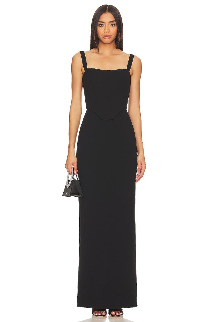 A sleek column silhouette in matte black crepe fabric defines this Frankie Maxi Dress, featuring a sophisticated square neckline and wide shoulder straps. The fitted bodice is boned for structure, complemented by a back vent slit for ease of movement. Double-lined for comfort, the dress fastens with a hidden back zipper closure and elastic straps enhance fit. Perfect for cocktail evenings, date nights, or stylish night outs, this minimalist yet elegant maxi offers timeless appeal and all-weather versatility.