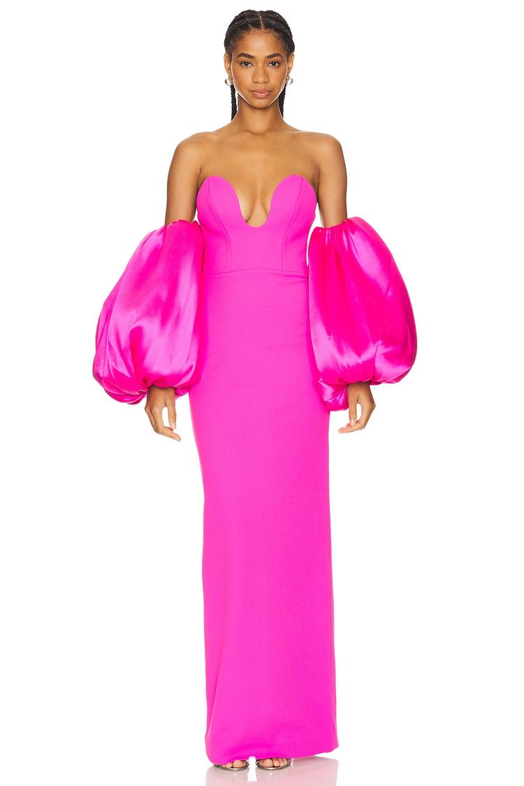 Bold and striking, this bright pink column maxi dress features a fitted silhouette that elegantly hugs the body. Crafted from midweight crepe fabric blended with polyester and spandex, it offers a comfortable stretch and smooth texture. The dramatic long balloon sleeves in optional twill satin add a sophisticated flair, while the plunging neckline and boned bodice enhance the evening-ready look. A hidden back zipper and back vent ensure ease of movement. Ideal for cocktail parties, formal events, and galas, this fully lined dress epitomizes refined elegance with standout design details.